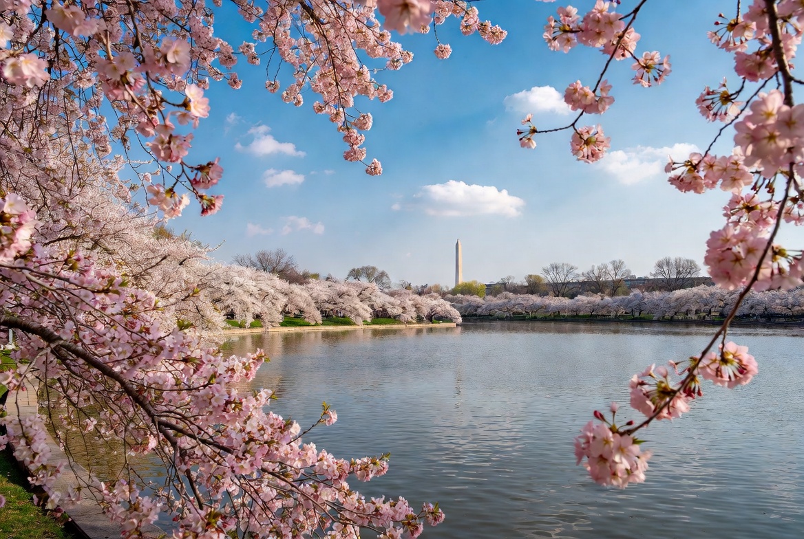 DC landmark, Tidal Basin, Washington Monument, blooming trees, blossoms, blue sky, branches, capital, clouds, foreground frame, iconic, lake, landscape, nature, obelisk, pink flowers, reflection, scenery, serene, spring, travel, trees, water, cherry blossoms