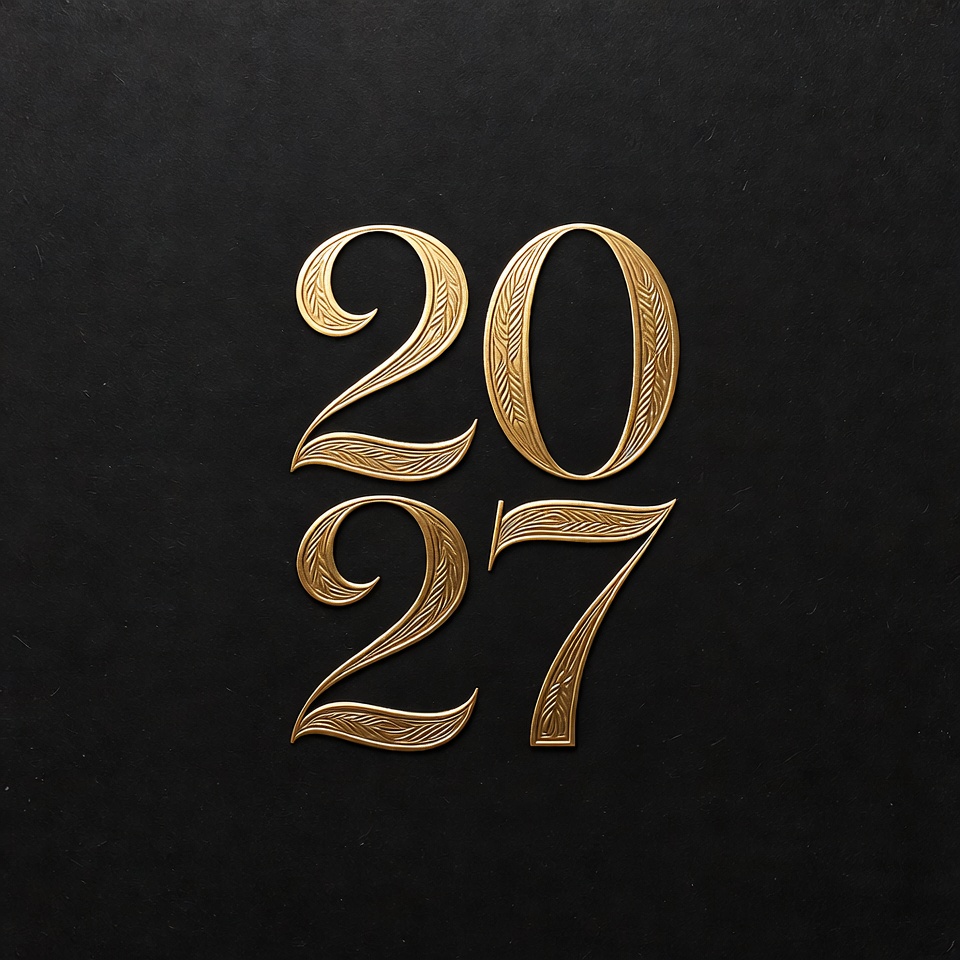 black background, bold numbers, countdown, dark backdrop, elegant numerals, feather pattern, festive year, future year, gold text, golden numbers, graphic design, isolated background, luxury font, metallic gold, new year, ornate design, shiny gold, typography, year 2027, 2027