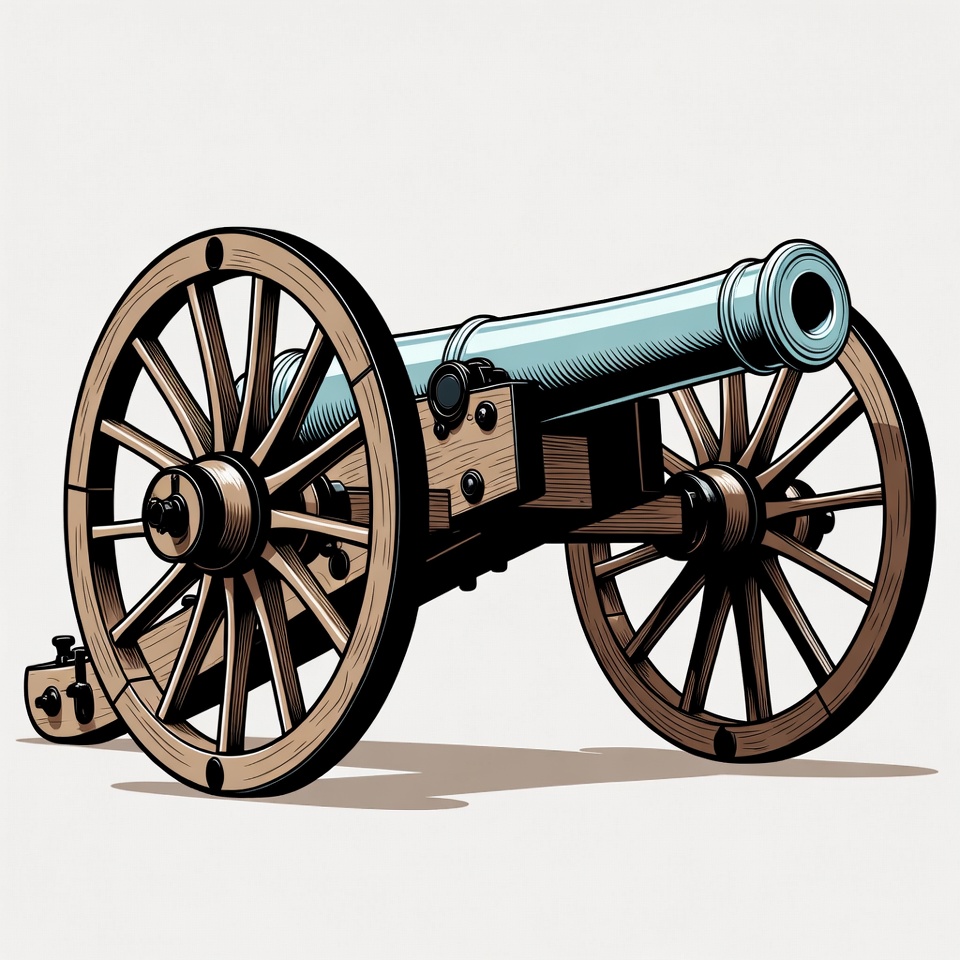 artillery, battlefield weapon, blue barrel, civil war cannon, clipart, firepower, gun carriage, historical weapon, illustration, isolated background, military history, vector art, vintage cannon, wooden wheels, cannon