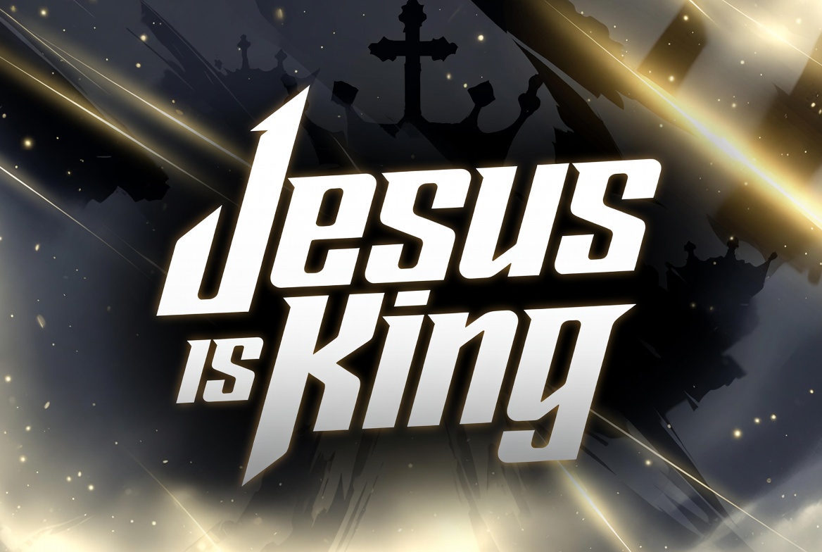 Bold white text 'Jesus is King' stands out against a dark background with golden glowing lights and a crown silhouette above a cross. Dramatic shadows and rays enhance the religious design. The graphic features edgy typography with metallic effects.
