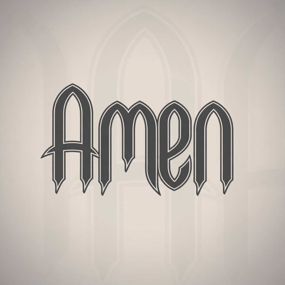 Christian symbol, arched design, black text, bold letters, calligraphy, clipart, decorative text, gothic font, gray background, illustration, isolated background, ornate letters, prayer word, religious word, typography, vintage font, Amen