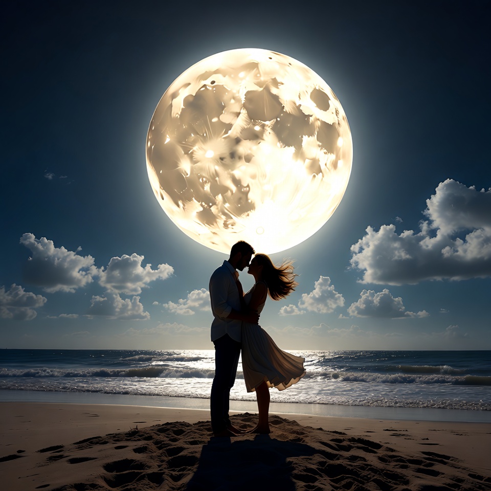 A silhouette of a man and woman embracing on a sandy beach at night, with a large glowing full moon rising behind them. The woman wears a flowing dress, and the man is dressed in light clothing. Gentle waves lap at the shore under a cloudy sky.