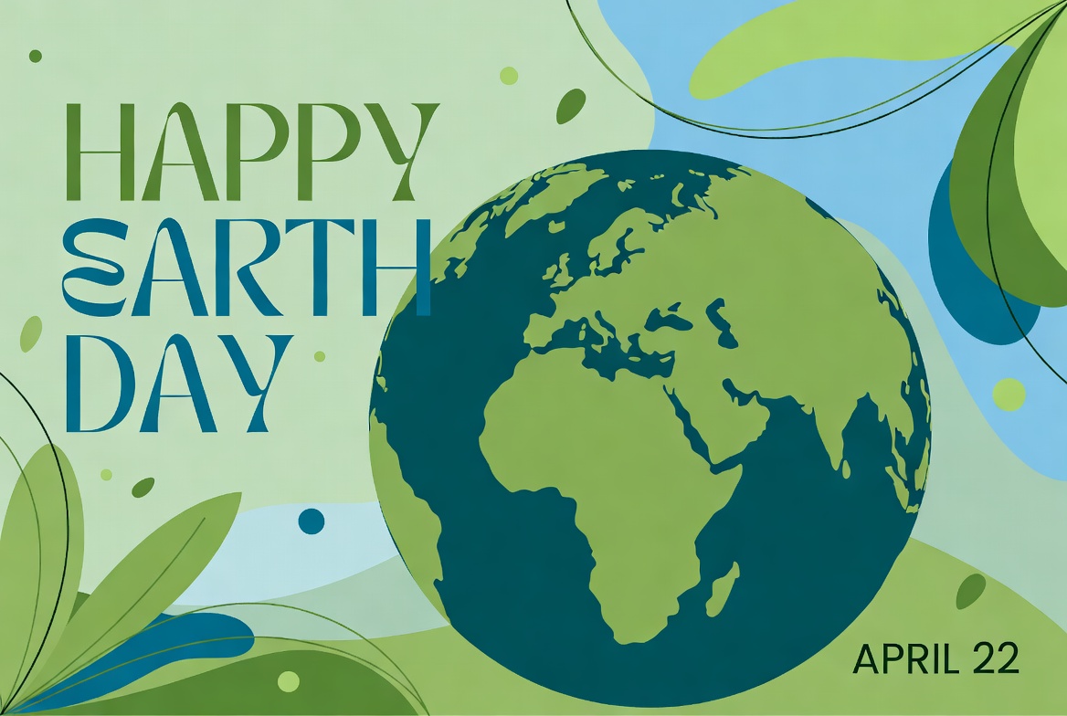 A vibrant illustration features a green Earth globe with dark outlines of continents centered on a mint green background. Bold text reads 'Happy Earth Day' above the globe and 'April 22' below. Green leaves and teal abstract shapes decorate the design.