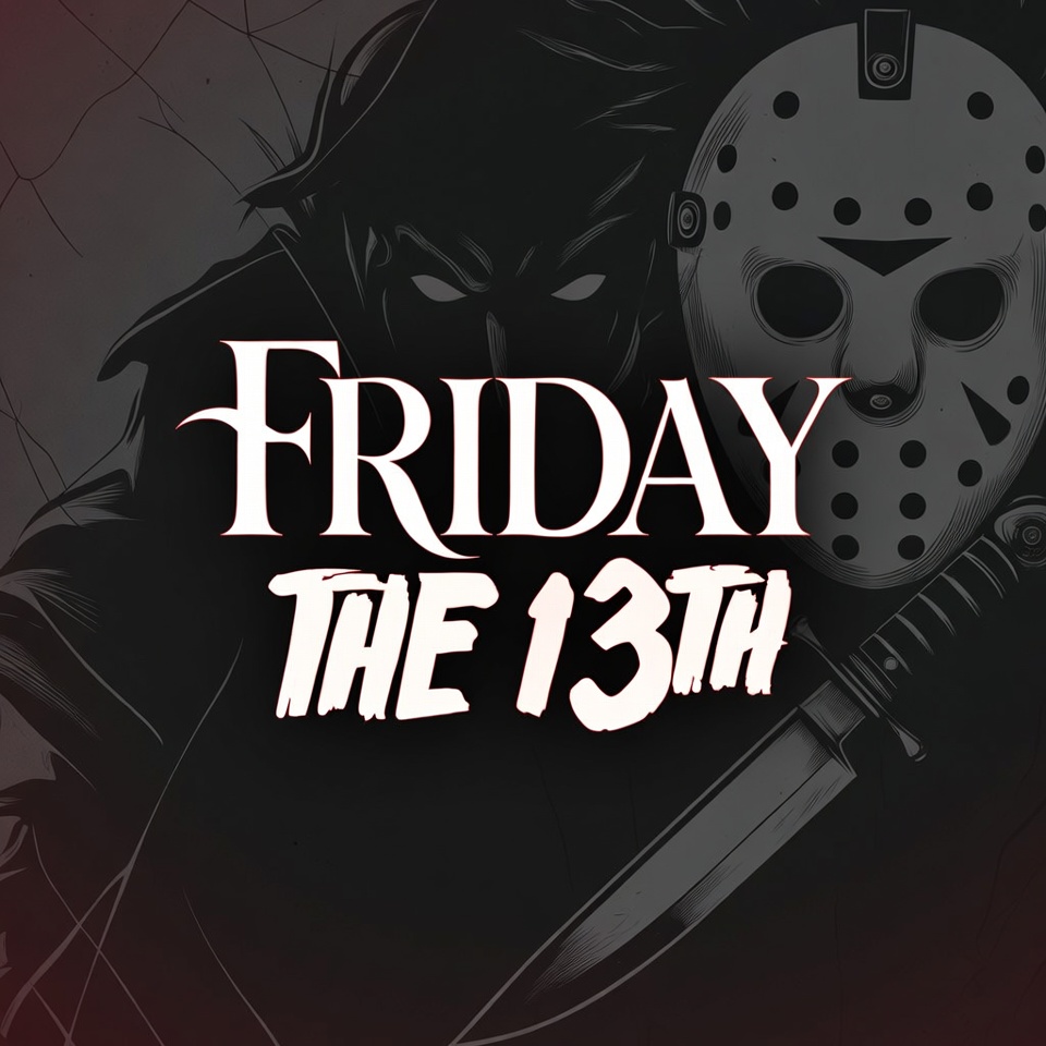 80s horror, Friday the 13th, Halloween, bold text, camp crystal lake, cult classic, dark background, eerie, frightening, gothic art, hockey mask, horror illustration, icon, knife weapon, machete, masked killer, movie poster style, red tones, silhouette, slasher villain, suspense, thriller, Jason Voorhees