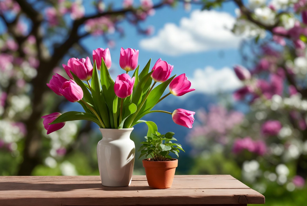 A bouquet of vibrant pink tulips stands in a white vase on a wooden table. Next to it is a small green plant in a terracotta pot. Blossoming pink cherry trees and a blue sky form a soft blurred background.