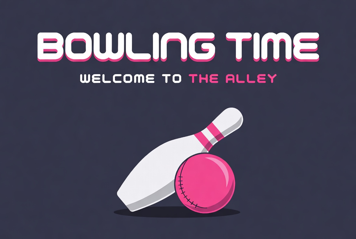 bowling alley, bowling ball, bowling pin, bowling time, clipart, fun, game, graphic, illustration, isolated background, navy background, neon text, pink ball, pink text, sign, sports, vector art, welcome alley, white pin, bowling