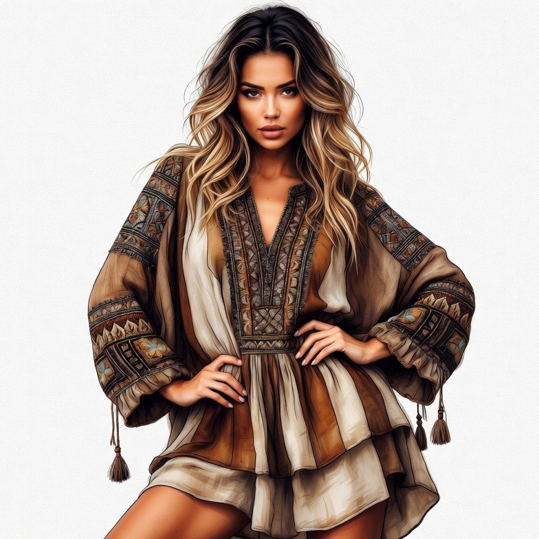 V-neck dress, White, beautiful, beige dress, boho dress, brown dress, brunette, confident pose, digital art, embroidered dress, ethnic style, fashion, female, fringe dress, hands on hips, illustration, isolated background, long hair, portrait, sexy, sexy woman, stylish outfit, wavy hair, young, woman