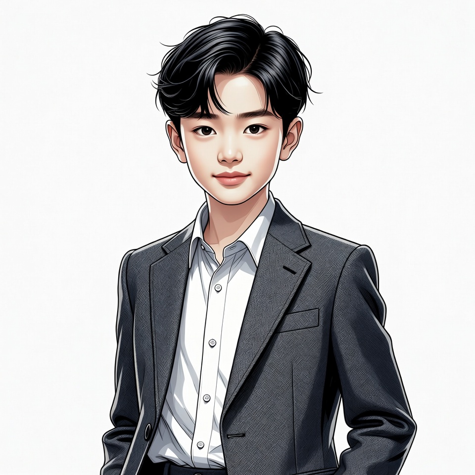 A young Asian boy with short black hair stands confidently wearing a black suit jacket, white dress shirt, and black pants. He faces forward with hands in pockets against a plain white background. The image is a detailed digital illustration.