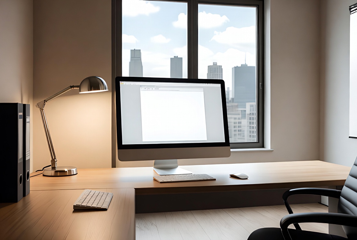 Modern Desk with Computer and City View