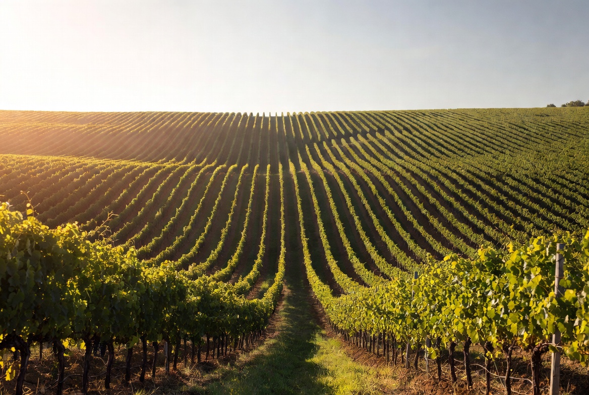 Rows of lush green grapevines stretch across rolling hills in a vineyard. A central path divides the neatly aligned vines under a golden sunset sky. The landscape features undulating terrain bathed in warm sunlight.
