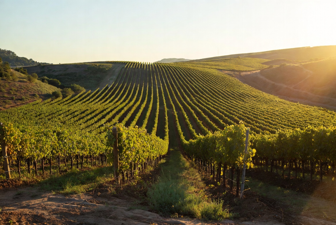 Rows of lush green grapevines stretch across rolling hills in a vast vineyard. The scene is captured during golden hour with sunlight illuminating the vines and casting warm glows on the landscape. A dirt path divides the symmetrical rows leading into the distance.