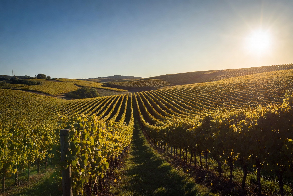 Rows of grapevines stretch across rolling hills under a vibrant sunset sky. Golden sunlight illuminates the lush green vines and earthy paths between them. Distant hills and a clear blue sky frame the expansive vineyard landscape.