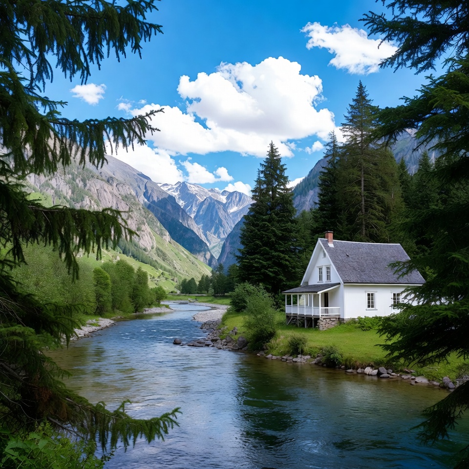 A charming white cabin with a sloped gray roof sits beside a winding river in a lush green valley. Tall pine trees and rocky mountains with snow-capped peaks surround the scene under a bright blue sky with fluffy white clouds. The cabin features a wooden porch and is framed by evergreen branches.