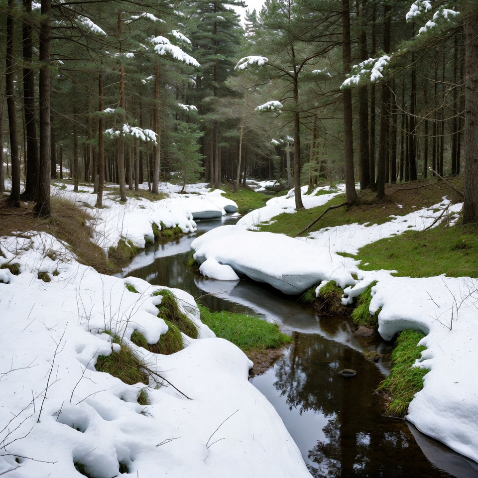 Snowy Stream in Pine Forest