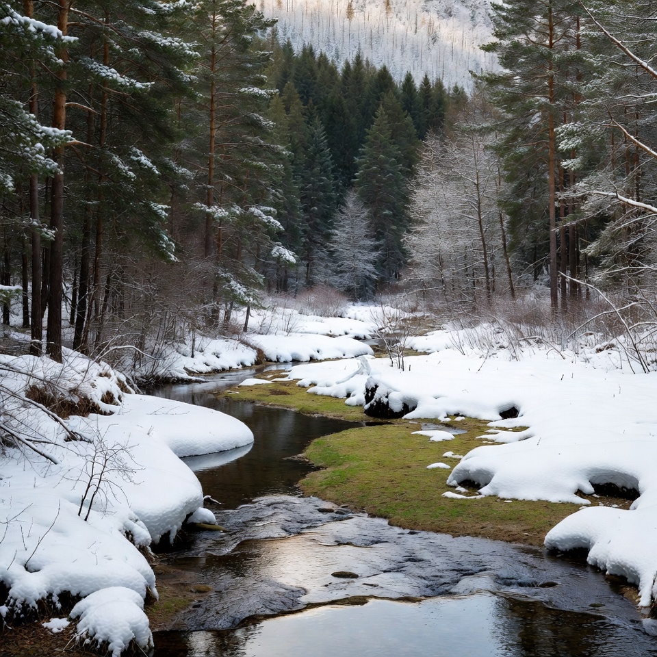 A serene winter landscape features a dense forest of pine and birch trees blanketed in snow. A narrow stream winds through the snowy ground, reflecting the surrounding trees and sky. Patches of green grass peek through the snow along the stream banks.