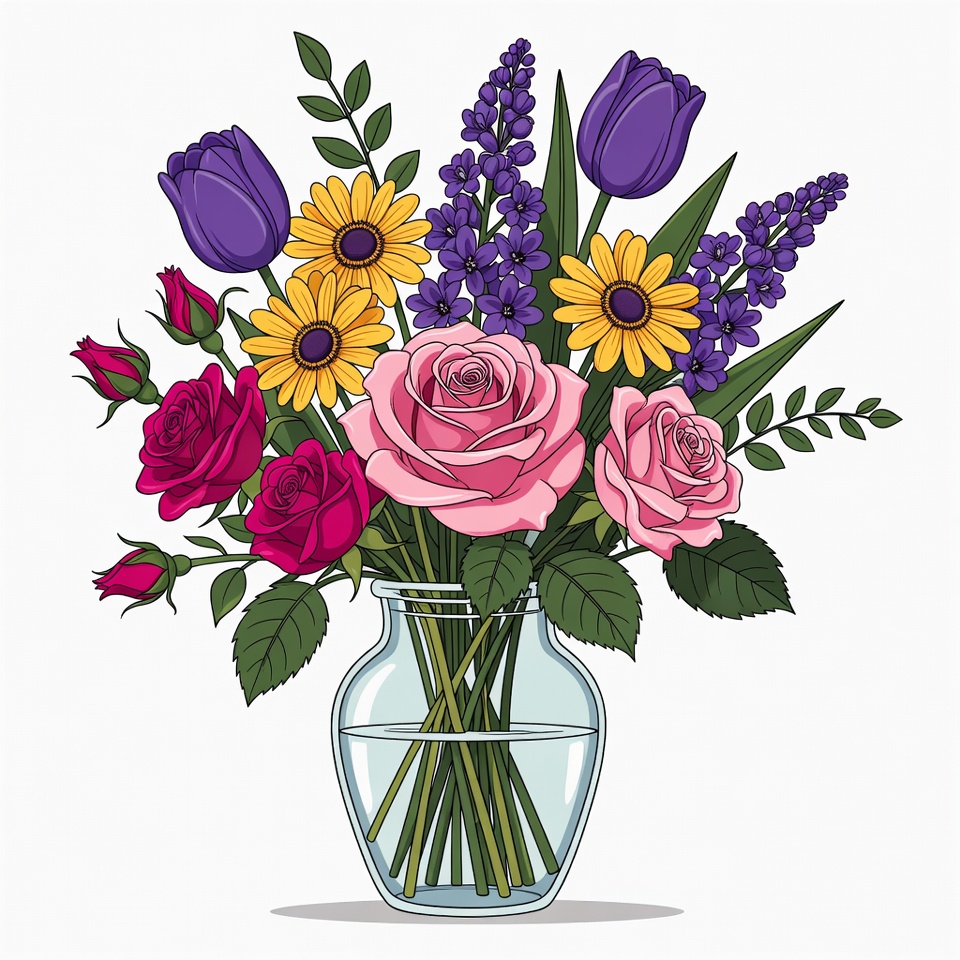 A vibrant bouquet of purple tulips, pink roses, yellow daisies, and lavender lilacs is arranged in a clear glass vase. The flowers feature detailed petals and green stems and leaves. The illustration is set against a white background.