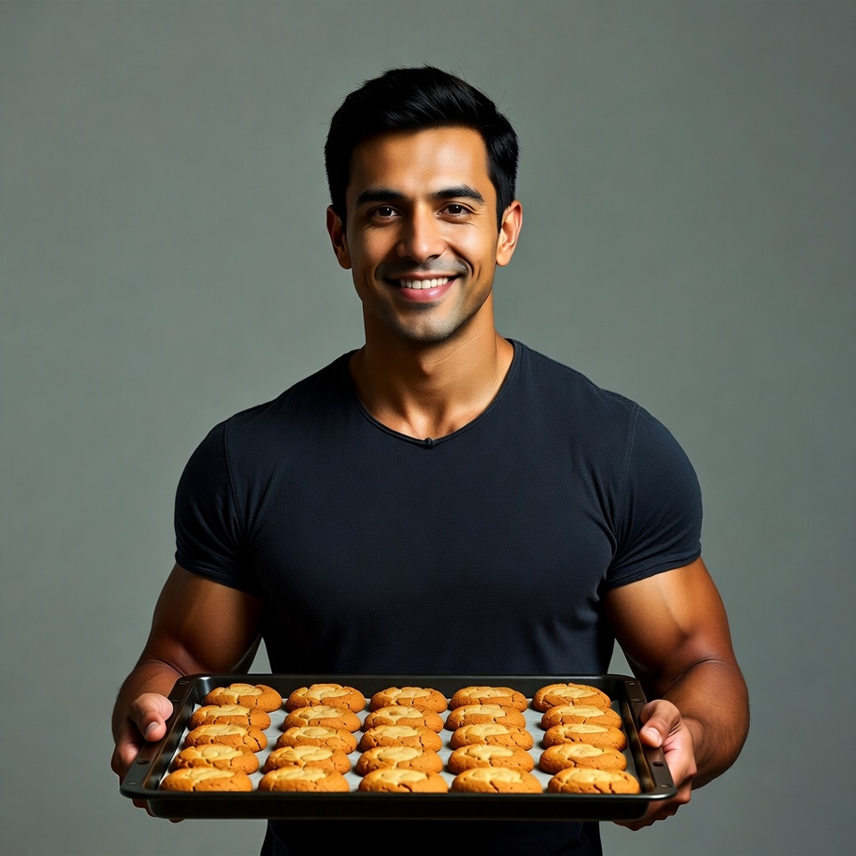 Indian man, South Asian, baked goods, baking tray, black hair, black t-shirt, confident pose, cookies, fit man, fresh cookies, golden cookies, gray background, handsome man, holding tray, male, muscular, short hair, smiling, studio photo, toned arms, man