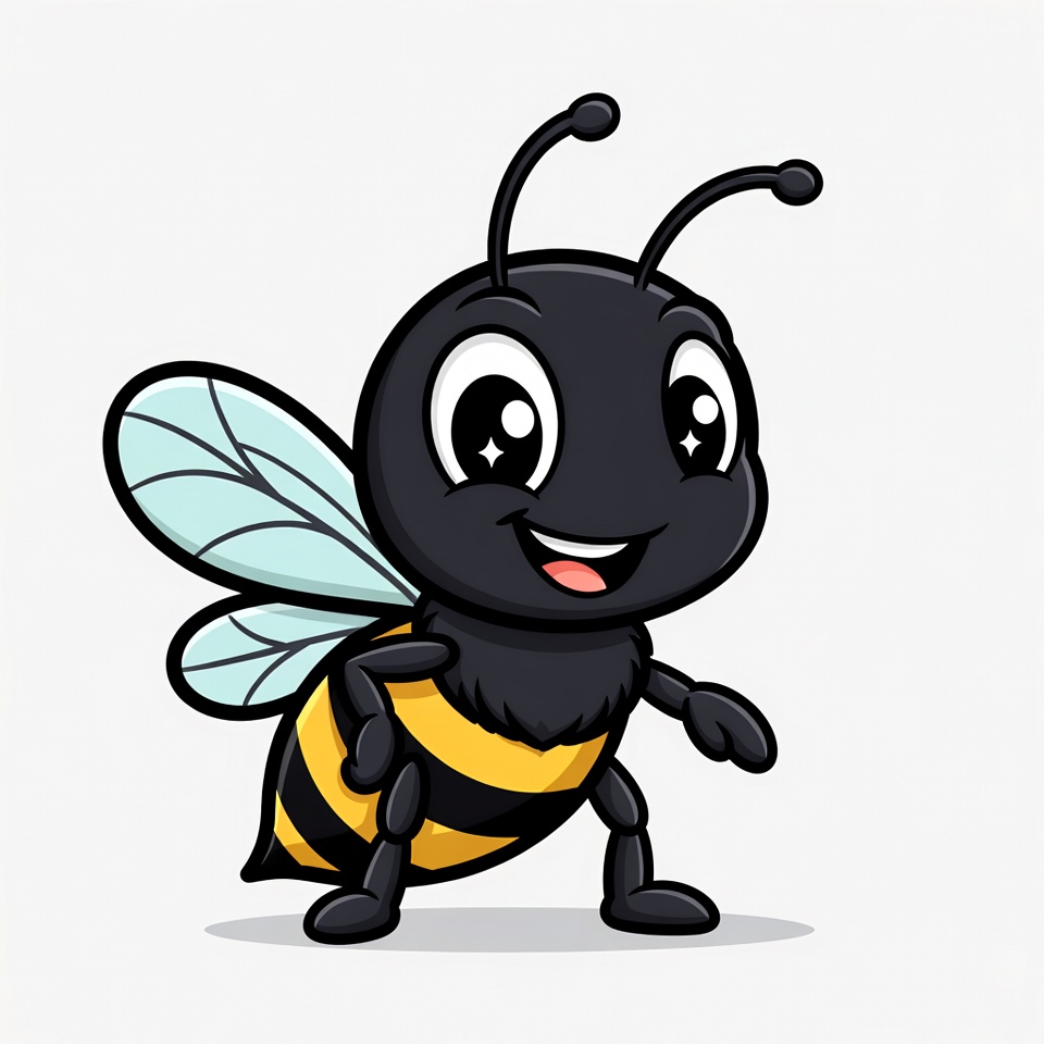 A kawaii-style cartoon bee with big sparkling eyes and a wide smile stands on a white isolated background. It has a black fuzzy body with yellow stripes, large translucent wings, and black legs posed in a friendly stance. The illustration features bold outlines and vibrant colors.