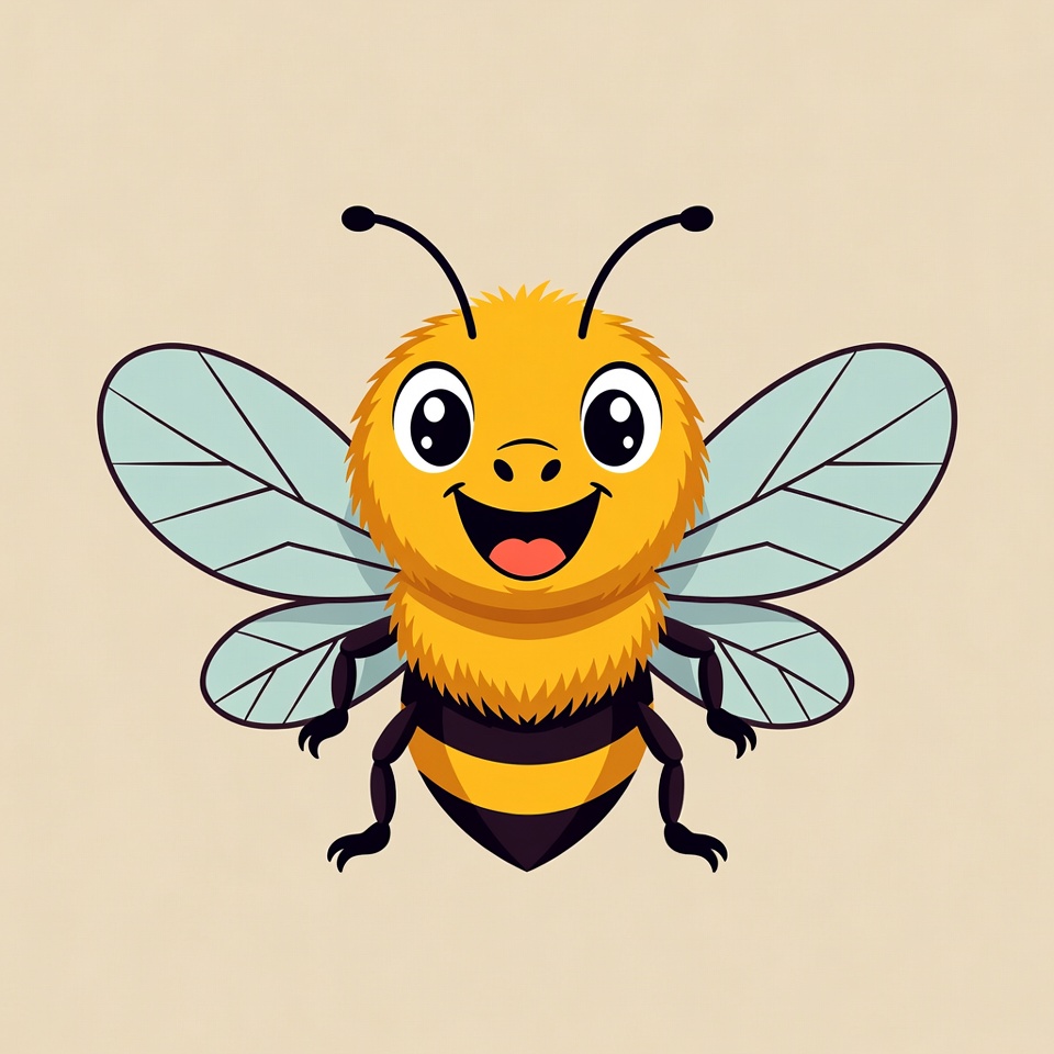 A vibrant cartoon bee with yellow fur, black stripes, and large sparkling eyes smiles happily. It has translucent blue wings and stands on six legs against a plain beige background. The illustration features a friendly, anthropomorphic expression.