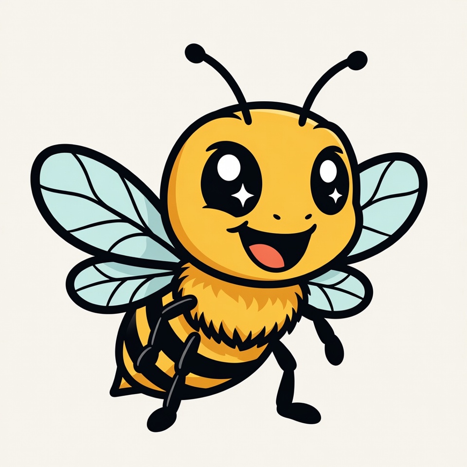 A kawaii-style cartoon bee with bright yellow fur and black stripes smiles happily on a white background. It has large sparkling eyes, translucent wings, and tiny legs. The bee's cheerful expression features an open mouth with a tongue.