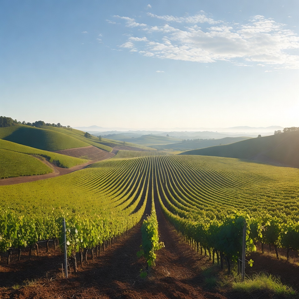Rows of lush green grapevines stretch across undulating hills under a clear blue sky. Sunlight illuminates the neatly aligned vines leading to distant misty mountains. The landscape features vibrant green fields and terraced slopes in golden hour light.