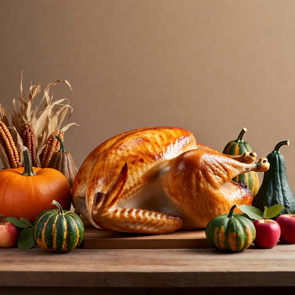A whole roasted turkey with golden-brown skin sits on a wooden board. It is surrounded by pumpkins, gourds, corn stalks, and apples on a rustic wooden table. The neutral beige background highlights the Thanksgiving harvest arrangement.