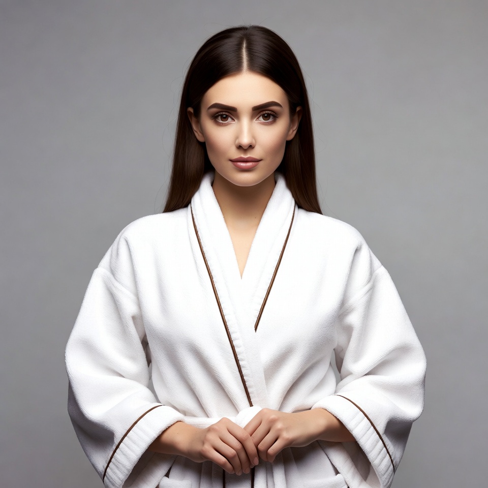 A young woman with long straight brown hair stands frontally against a plain gray background. She wears a fluffy white bathrobe with brown trim along the edges and collar. Her hands are clasped together in front of her, and she has a subtle smile.