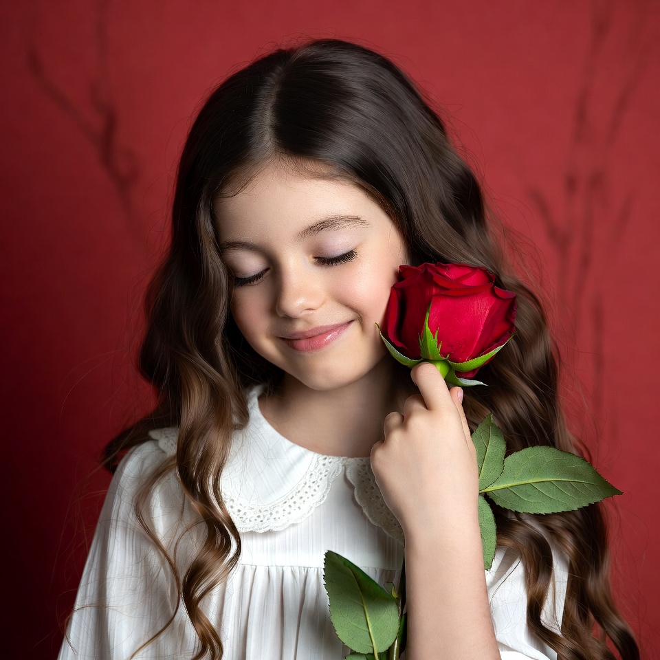 A young girl with long wavy brown hair smiles gently while holding a large red rose close to her face. She wears a white collared dress with lace details. The image features a solid red background with subtle tree branch shadows.