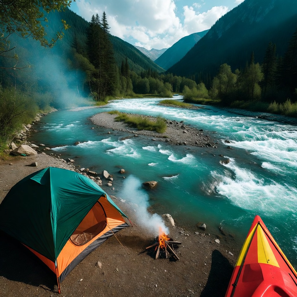 A green dome tent is pitched on a rocky riverside with a campfire burning nearby. A red kayak rests beside the tent next to the turquoise rapids of a winding river. Lush green forests and majestic mountains surround the scenic campsite under a partly cloudy sky.