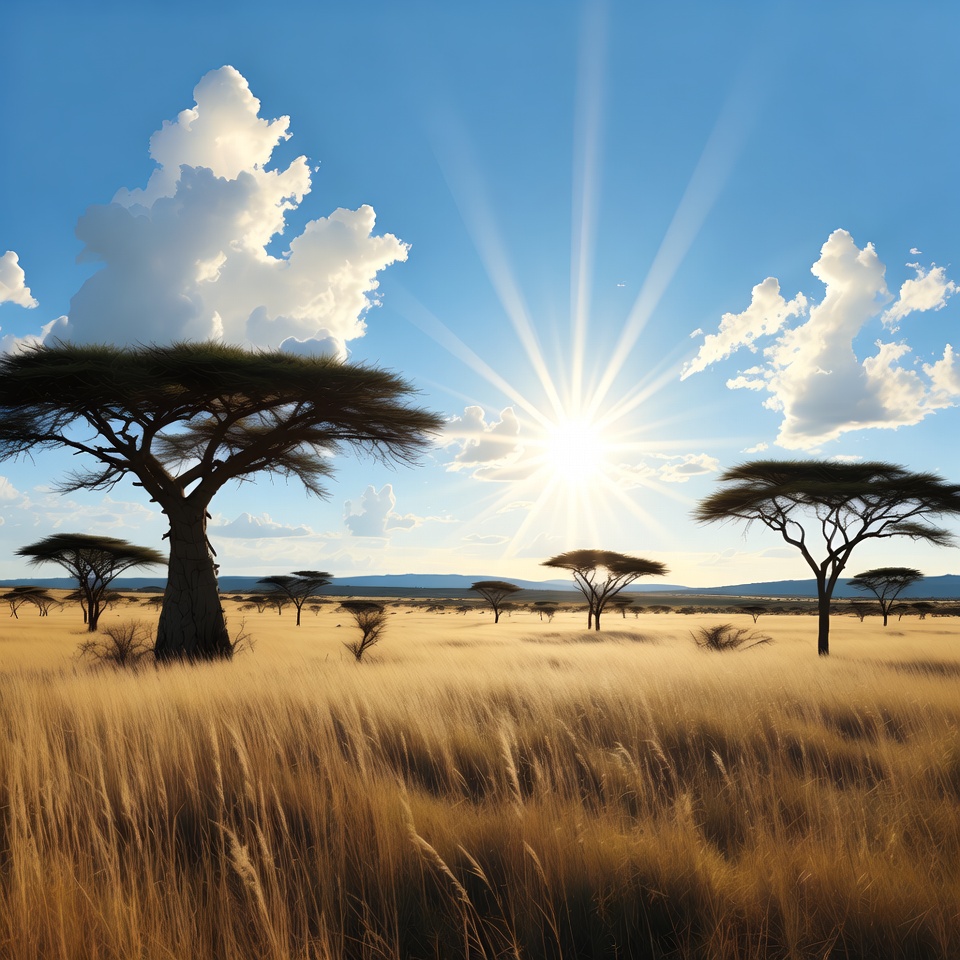A vast golden grassland savanna stretches under a bright blue sky with fluffy white clouds. Tall acacia trees with flat tops dot the landscape, silhouetted against the radiant sun rays beaming from the horizon. The scene captures the expansive African plains in golden hour light.