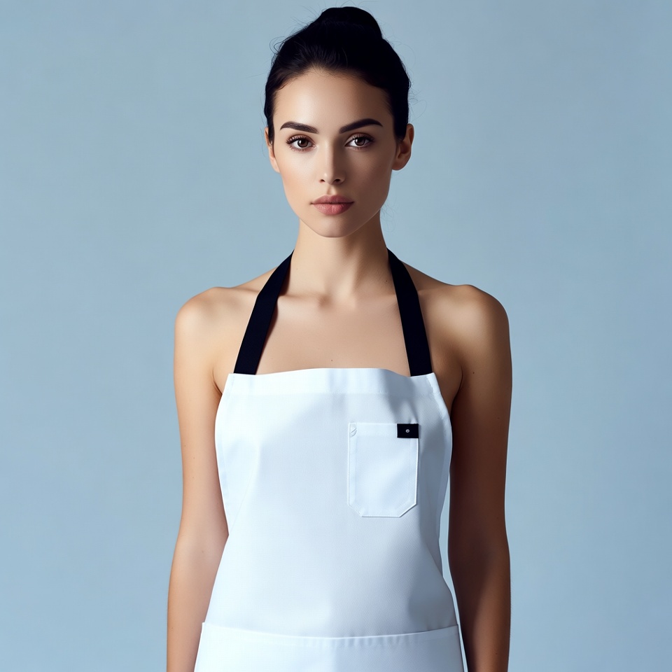 A young woman with dark hair in a bun stands against a blue background wearing a white apron with black straps over her shoulders. She has a neutral expression and fair skin. The apron features a small pocket on the chest.