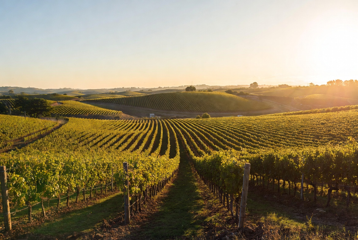 Expansive vineyard with rows of grapevines stretches across rolling hills under a golden sunset sky. A dirt path runs between the neatly aligned vines supported by wooden posts. The landscape features gentle hills and distant fields bathed in warm sunlight.