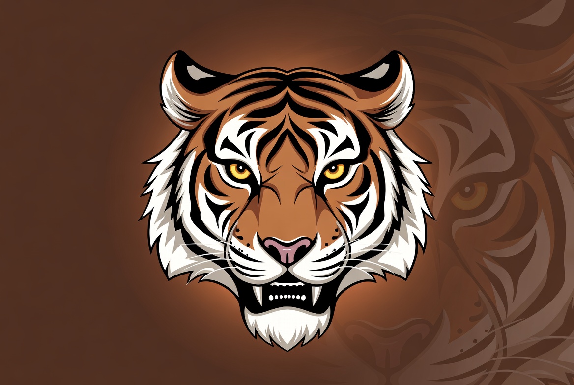 A detailed digital illustration of a tiger's face with intense yellow eyes and sharp fangs. The tiger features bold orange and black stripes on a brown gradient background. White fur accents highlight the muzzle and ears.