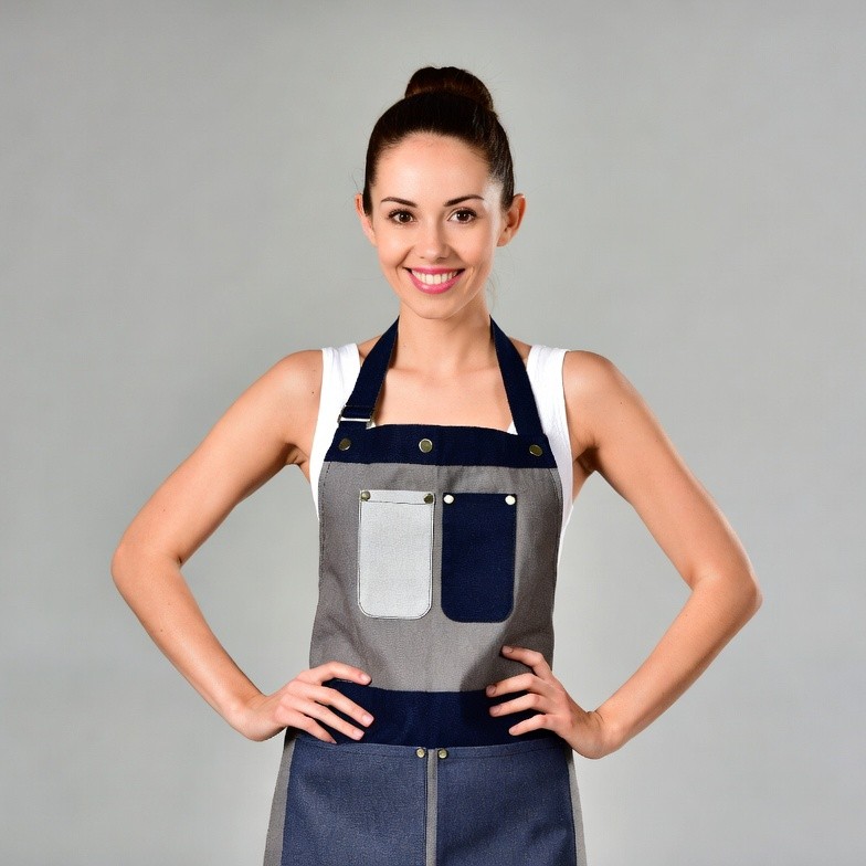 White, apron, bun hairstyle, female, gray apron, hands on hips, isolated background, navy apron, smiling woman, white top, young woman, woman