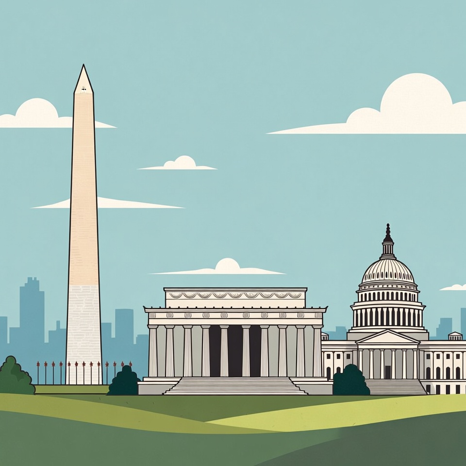 A colorful flat illustration depicts the Washington Monument, Lincoln Memorial, and US Capitol against a blue sky with clouds. Green grass and trees frame the landmarks in the foreground, with a city skyline in the background. The vector-style artwork features clean lines and pastel tones.