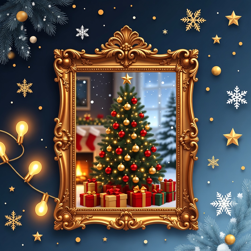 A beautifully decorated Christmas tree with red and gold ornaments stands in a cozy room with a fireplace and stockings. The tree is framed by an ornate gold picture frame, surrounded by floating snowflakes, stars, and golden orbs on a dark blue background. Presents wrapped in red and green paper are piled at the base of the tree.
