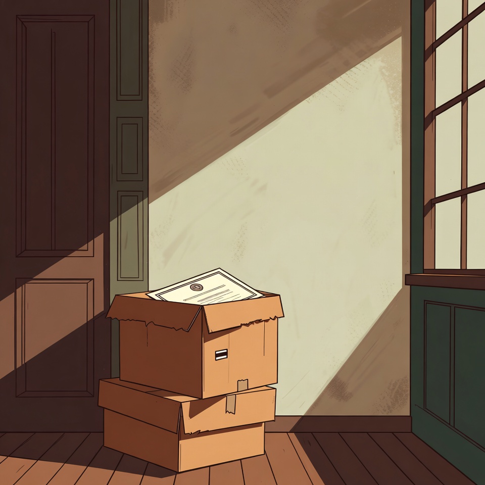 anime style, beams, boxes interior, document, empty room, empty space, green trim, illustration, interior, light rays, moving boxes, open box, paper, stacked boxes, storage boxes, sunlight, sunlit room, taped box, unpacked boxes, window, wooden door, wooden floor, cardboard boxes