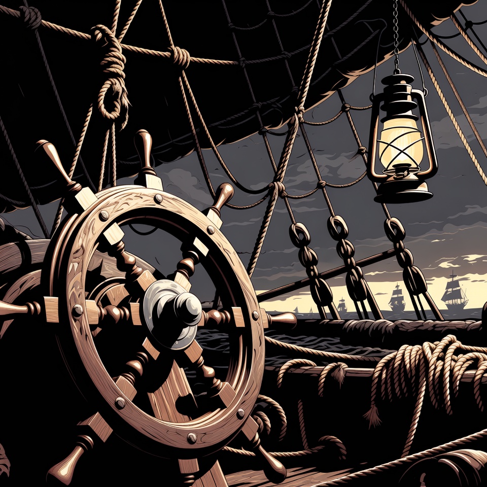 A detailed illustration of a wooden ship's steering wheel on a pirate vessel deck. Thick ropes and rigging surround the wheel, with a hanging lantern casting light nearby. Distant ships are visible on a dark, stormy sea under a cloudy sky.