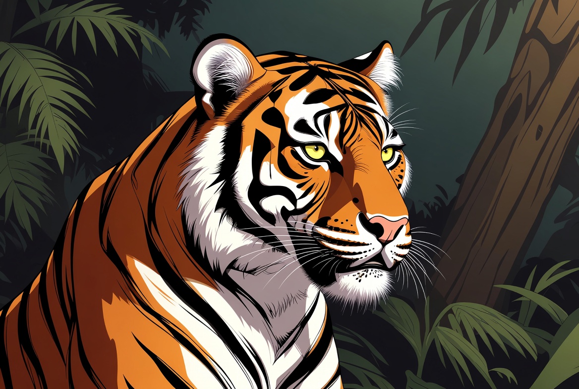 A detailed vector illustration of a tiger with orange fur and black stripes stares to the side. It stands amid lush green jungle foliage and trees on a dark background. The tiger's green eyes and white facial markings are prominently featured.