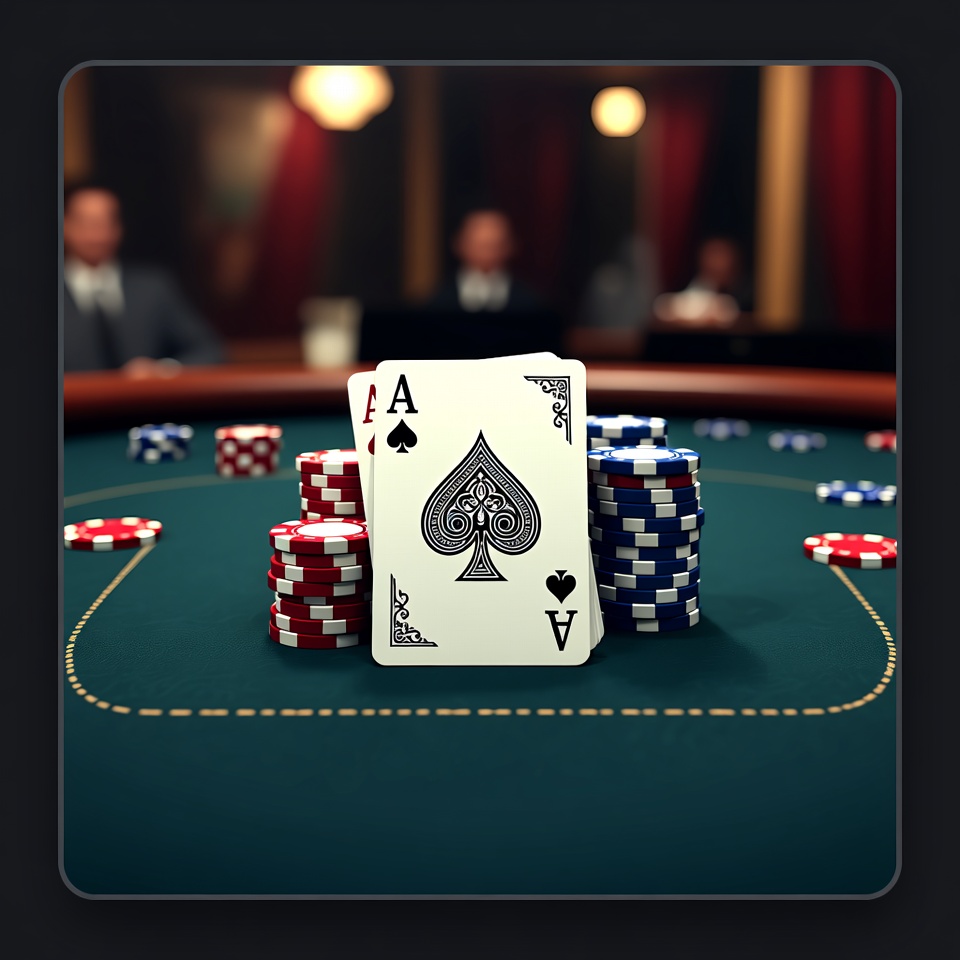 A prominent Ace of Spades playing card sits upright on a green felt poker table surrounded by stacks of red and blue poker chips. Blurred suited men are visible in the background near a dimly lit casino setting with red curtains. Scattered chips and cards enhance the gambling table scene.