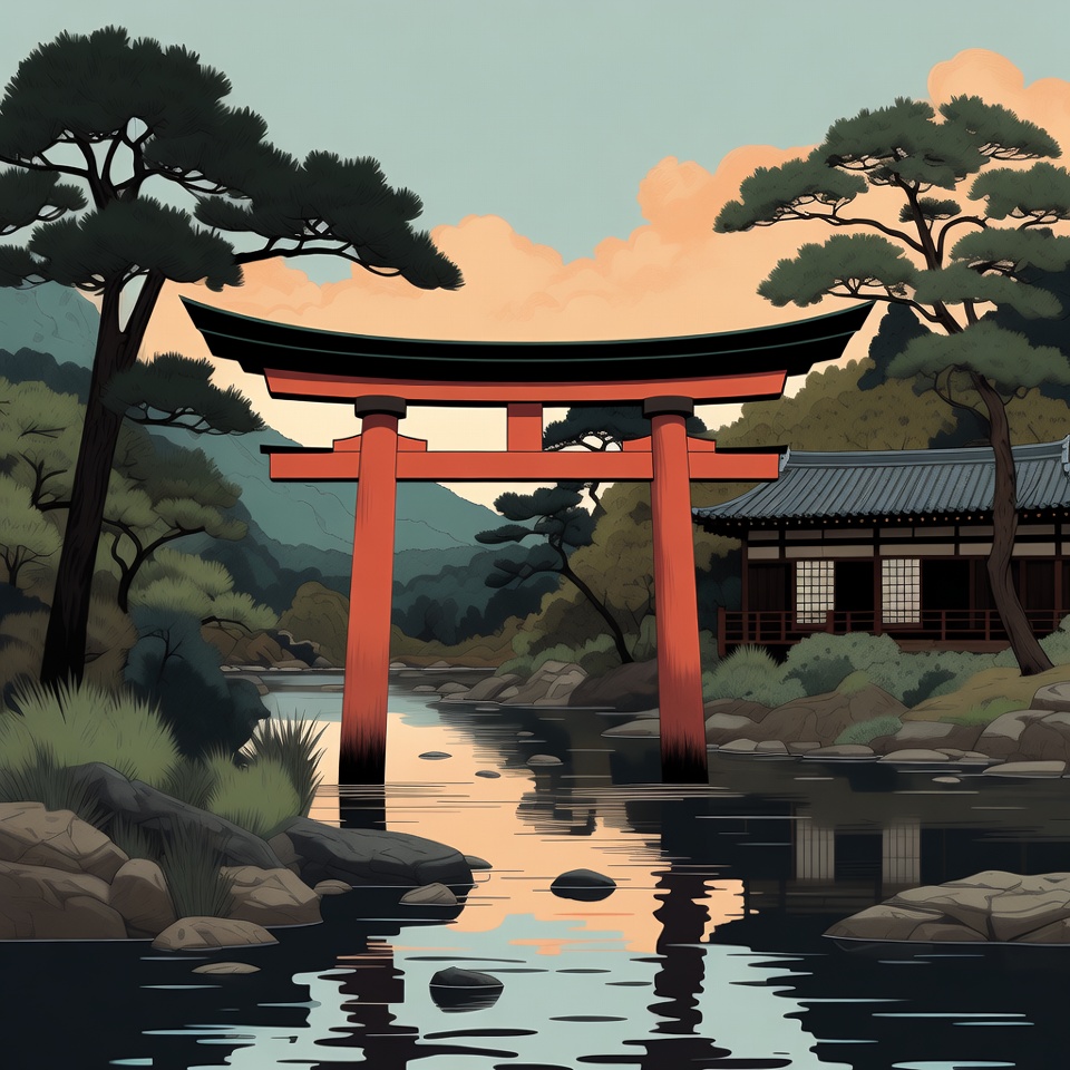 Japan landscape, Japanese gate, Japanese temple, Shinto shrine, digital art, forest, green foliage, illustration, mountains, nature, pine trees, red torii, river, rocks, serene scenery, shrine building, stream, sunset sky, torii shrine, traditional architecture, water reflection, woodland path, torii gate