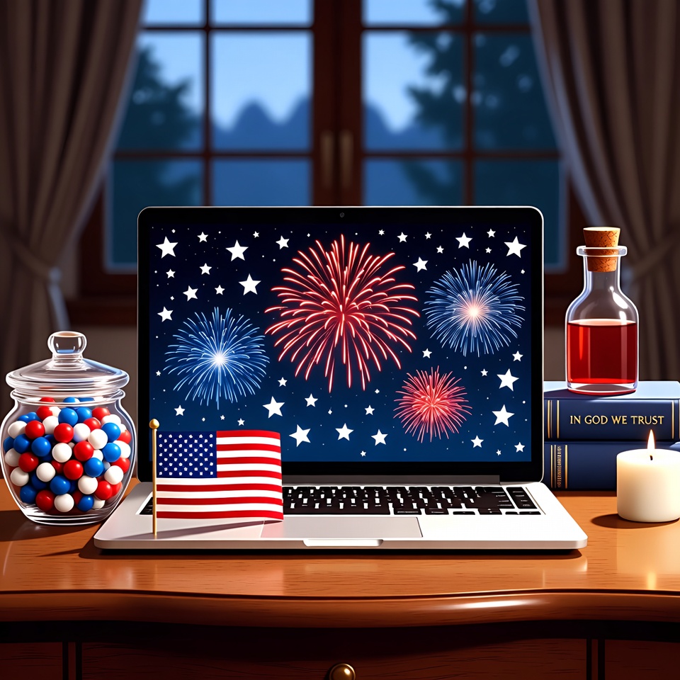 4th of July, American flag, Independence Day, book, candle, candy jar, digital art, fireworks, glass bottle, illustration, isolated background, mountains, night sky, patriotic, red white blue, stars, trees, window view, wooden desk, laptop