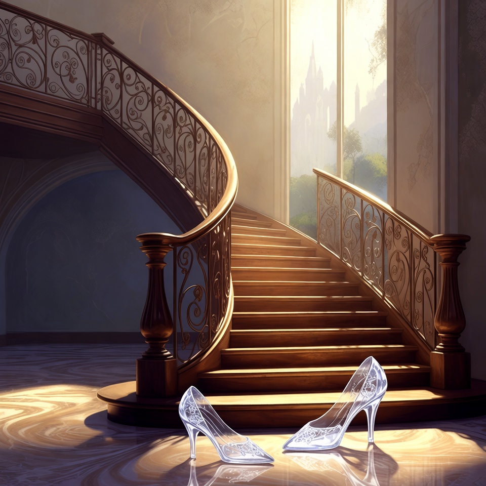 Cinderella slippers, arched windows, castle interior, castle view, digital art, elegant decor, fairy tale, fantasy scene, golden light, grand staircase, high heels, illustration, luxury architecture, marble floor, ornate railing, spiral staircase, sunlight, transparent shoes, wooden stairs, glass slippers