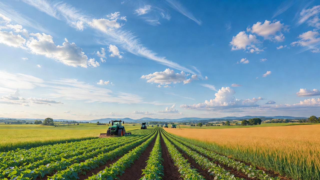 agriculture, blue sky, clouds, crop harvesting, crop rows, farming, farmland, fields, golden wheat, green fields, green tractor, harvest, hills, machinery, outdoor farming, rural landscape, soybean field, sunny day, wheat crops, tractors