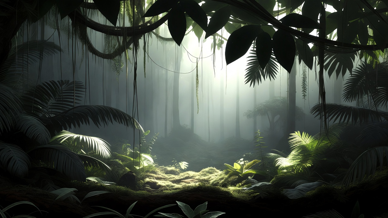 A dense jungle forest features thick hanging vines, large green leaves, and tall ferns in a misty atmosphere. Soft light filters through the canopy, illuminating mossy ground and lush foliage. The scene showcases intricate tropical vegetation on an isolated background.