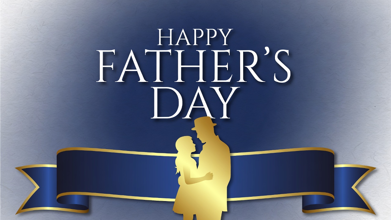 A golden silhouette of a father in a hat hugging his daughter stands on a navy blue background. Bold white 'Happy Father's Day' text appears above the silhouettes. A curved navy blue ribbon with gold edges frames the bottom of the silhouettes.