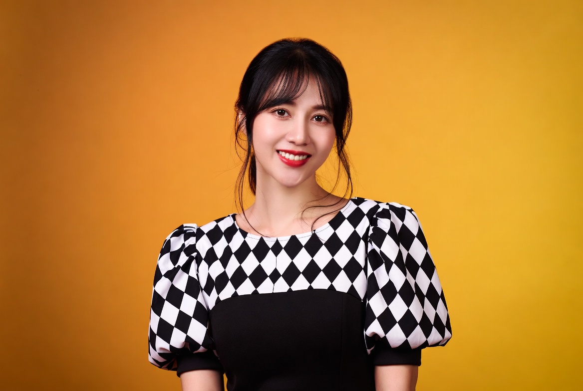 A young Asian woman with long black hair smiles at the camera against a vibrant orange-yellow background. She wears a stylish black dress with puffed sleeves and a harlequin black-and-white checkered pattern on the upper part. Her hair is styled with bangs and loose strands framing her face.
