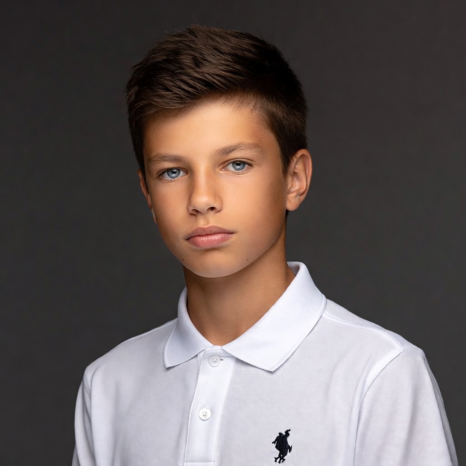 White, adolescent, black logo, blue eyes, brown hair, child, gray background, headshot, kid, male, polo shirt, pony logo, portrait, serious expression, short hair, teenager, white polo shirt, young boy, boy
