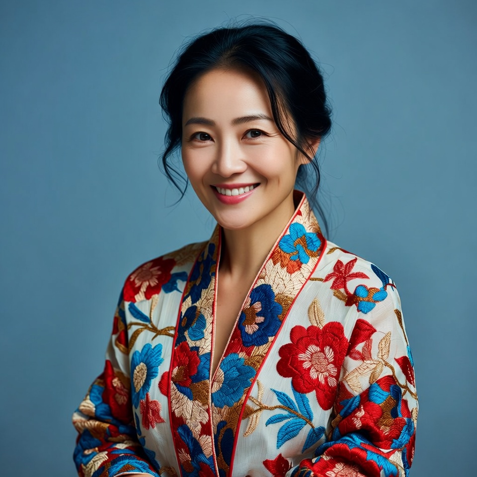 A smiling Asian woman with black hair styled in a neat updo stands against a solid blue background. She wears a traditional embroidered kimono robe featuring intricate floral patterns in red, blue, and white. Her expression is warm and engaging with subtle makeup.