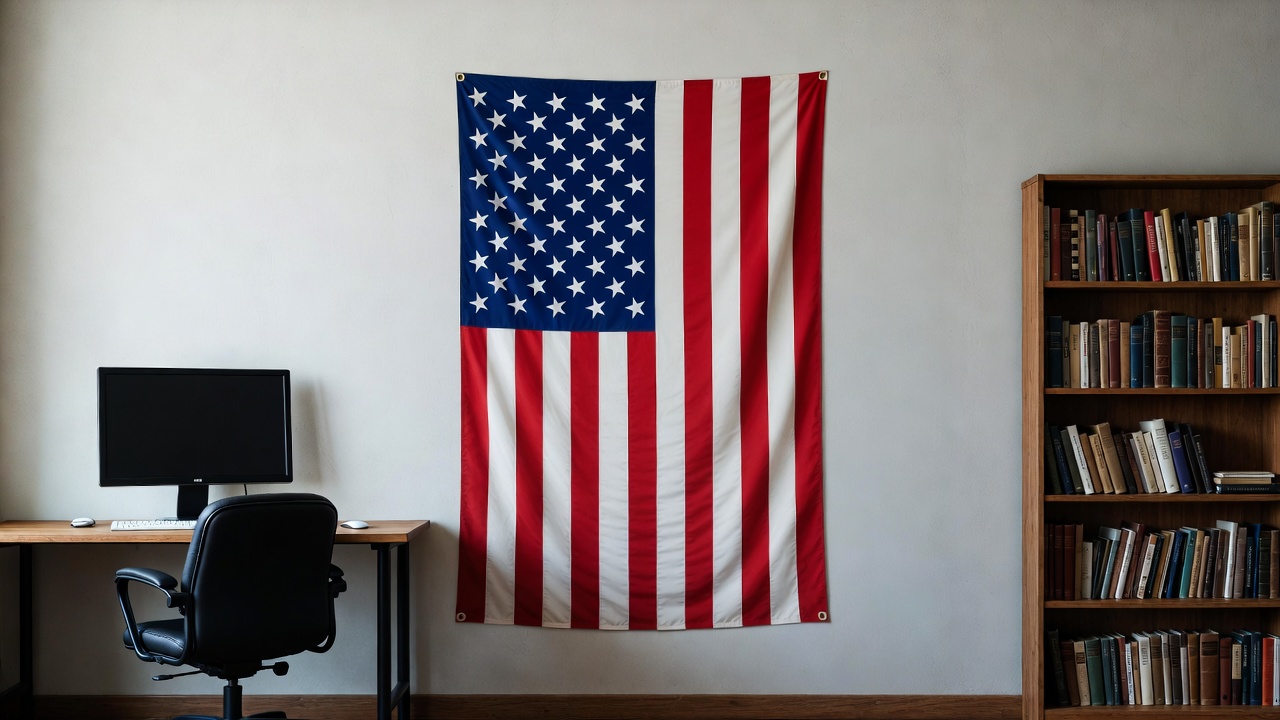 A large American flag hangs on the wall in a modern office room. A wooden desk with a black office chair and a computer monitor sits in front of the flag. A tall wooden bookshelf filled with books stands to the right.